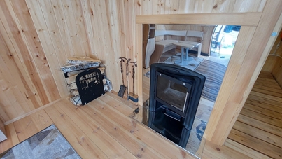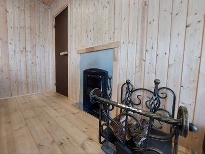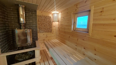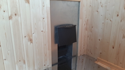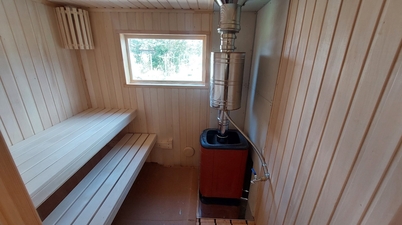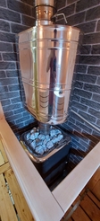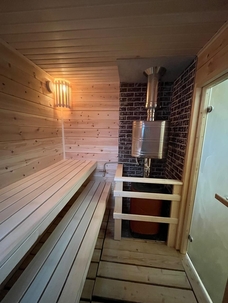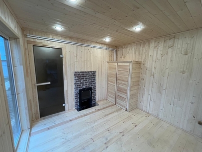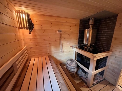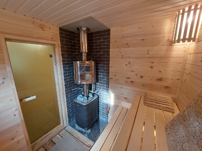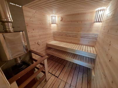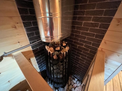 Стены и потолок в углу, где стоит банная печь защищены от перегрева термостойкими огнеупорными плитами. Сэндвич труба дымохода изолирована негорючей каменной ватой.
