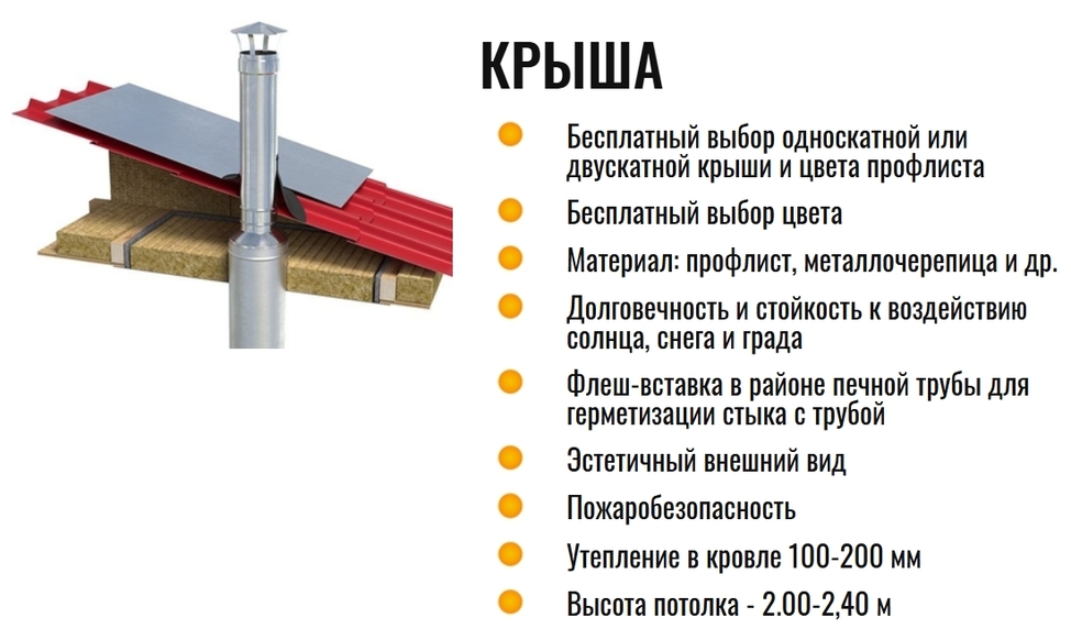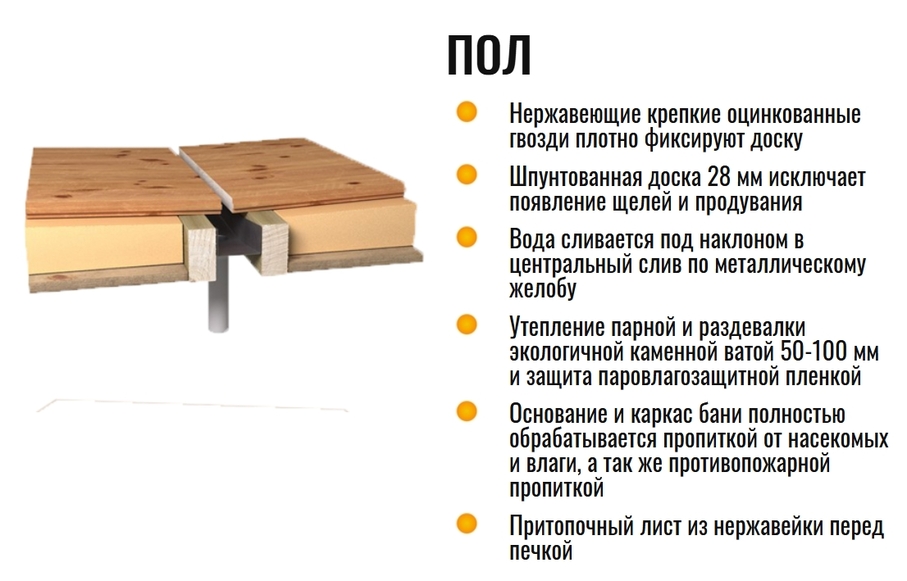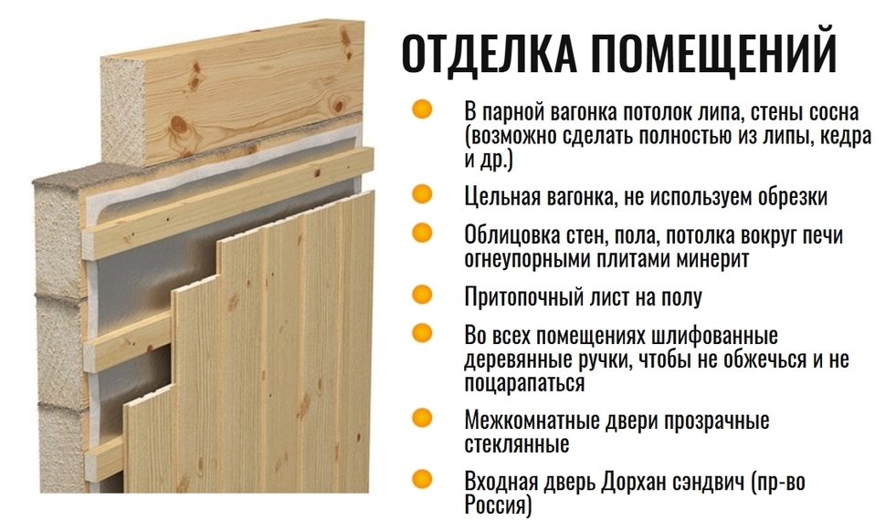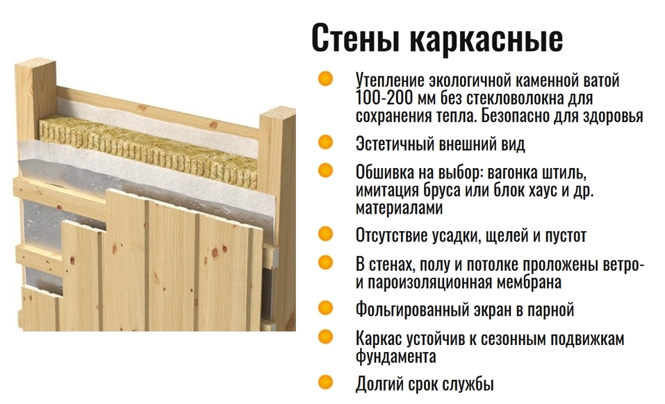 В наших банях мы используем пожаробезопасный утеплитель. Он обладает следующими свойствами: негорючий, устойчив к повышенной влажности, безопасен, хорошо держит тепло, долговечен.