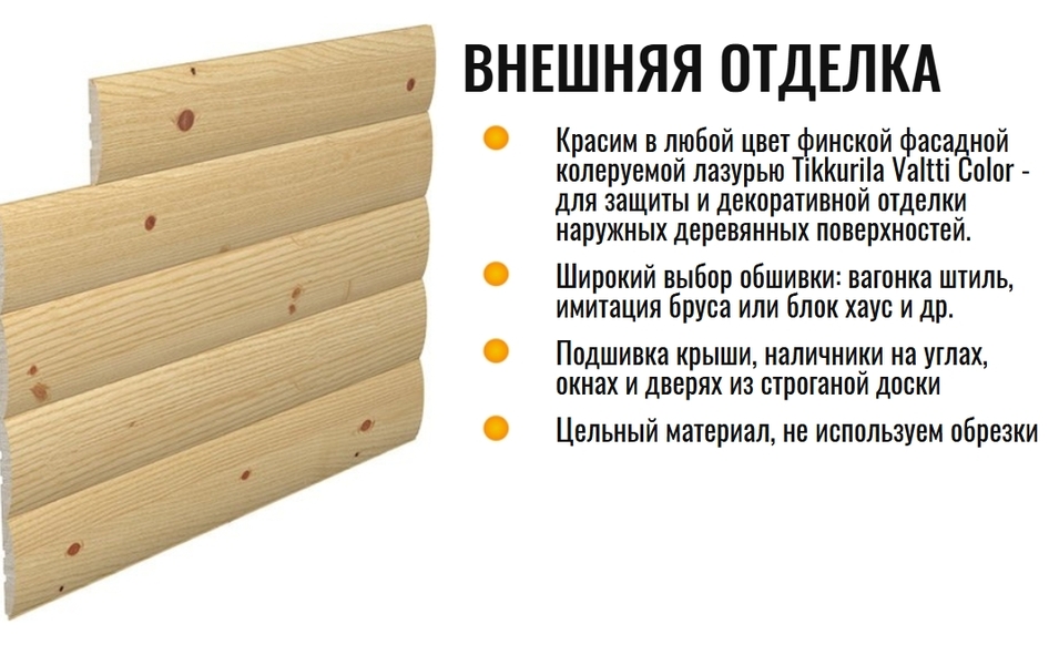 Для защиты и декоративной отделки наружных поверхностей деревянных стен мы используем финскую фасадную колеруемую лазурь Tikkurila Valtti Color.
